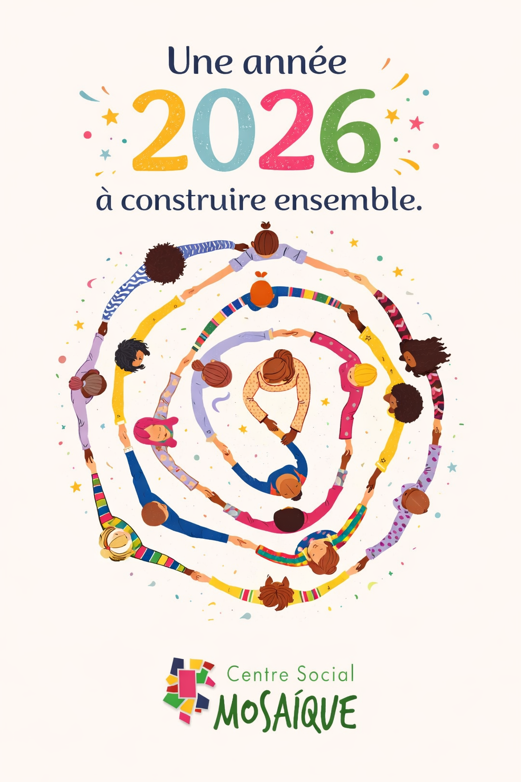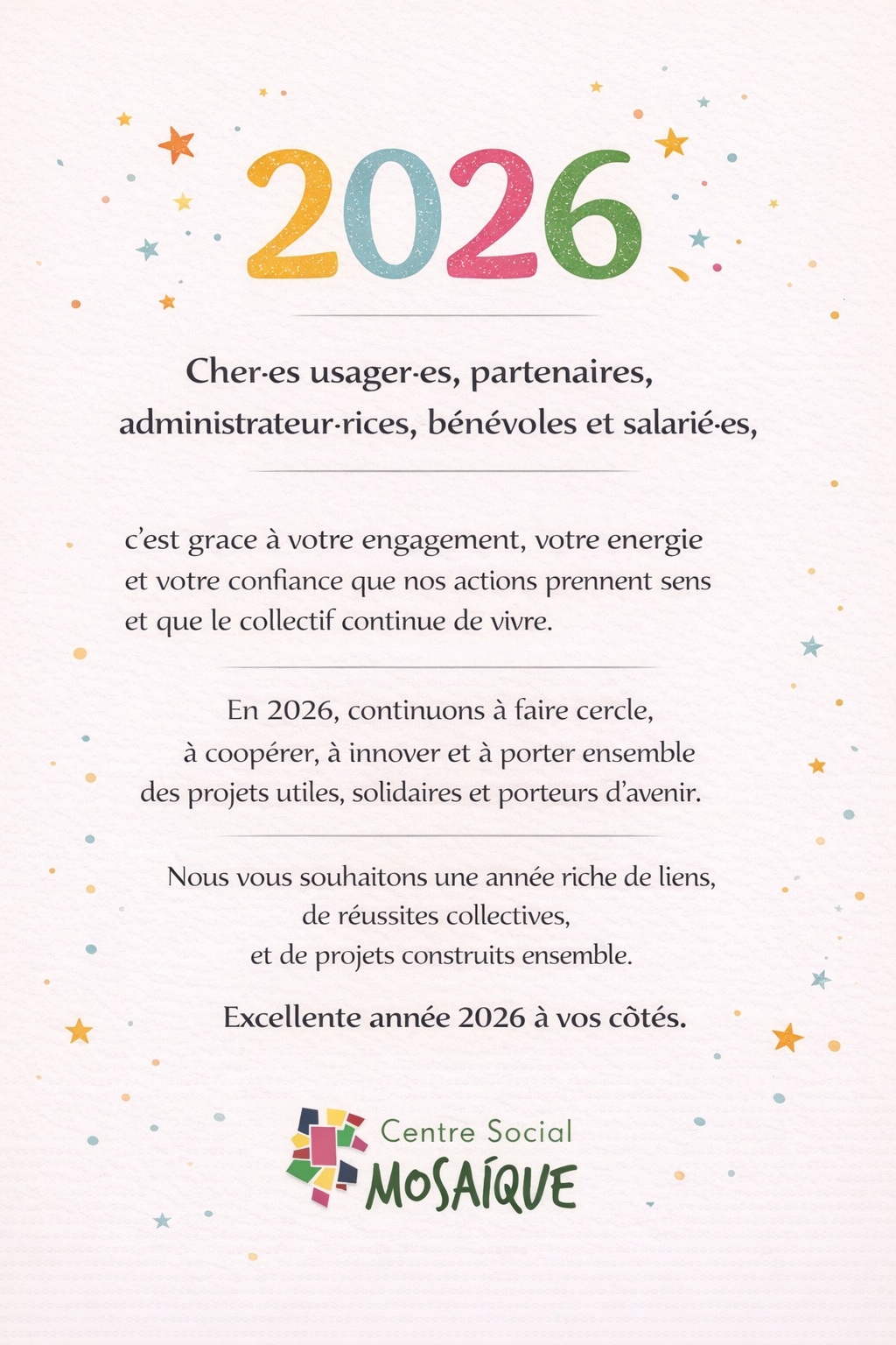 Toute l’équipe du Centre Social Mosaïque vous adresse ses meilleurs vœux pour cette nouvelle année : santé, bonheur, projets et moments de partage. Que 2026 soit une année riche en rencontres et en convivialité.