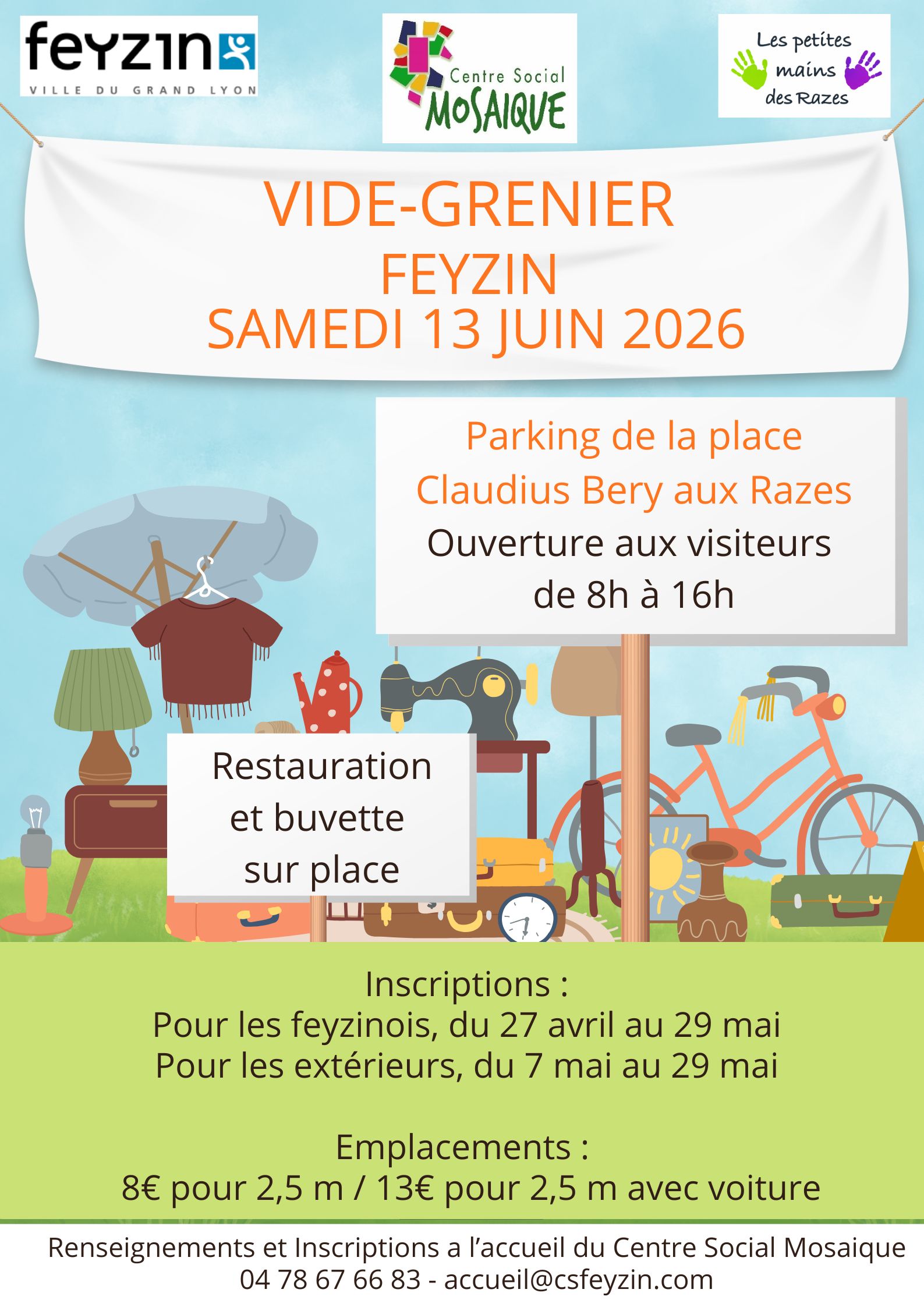 Un vide-grenier s’installe place des Razes le samedi 13 juin. Pour ceux qui souhaitent exposer, les inscriptions démarrent le 27 avril pour les feyzinois et à partir du 7 mai pour les extérieurs.
