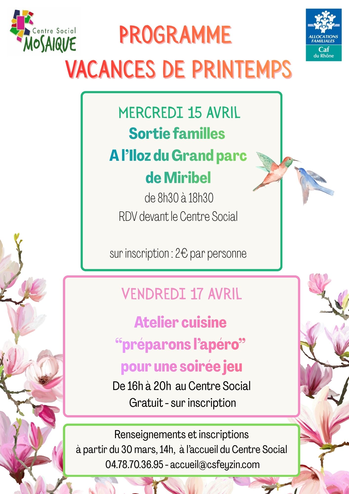 C’est le printemps, le centre social vous propose un programme de vacances haut en couleurs. N’hésitez pas à vous inscrire aux ateliers proposés !